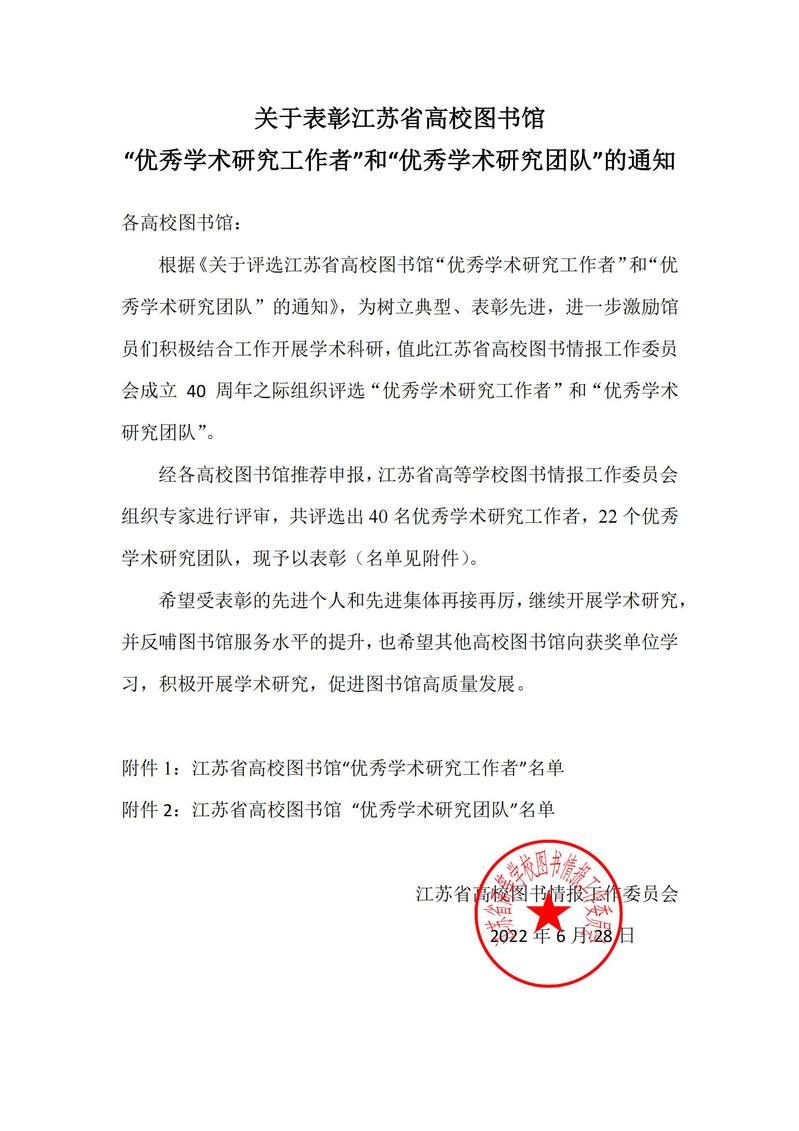 为树立典型、表彰先进,进一步激励图书馆馆员积极结合工作开展学术科研,今年,江苏省高校图书情报工作委员会首次开展江苏省高校图书馆“优秀学术研究团队”“优秀学术研究工作者”评选活动,对2011年以来学术研究取得突出成绩的团队及个人进行表彰。经各高校图书馆推荐申报,江苏省高等学校图书情报工作委员会组织专家进行评审,共评选出22个优秀学术研究团队,40名优秀学术研究工作者,其中开元官网图书馆被表彰为江苏省高校图书馆“...