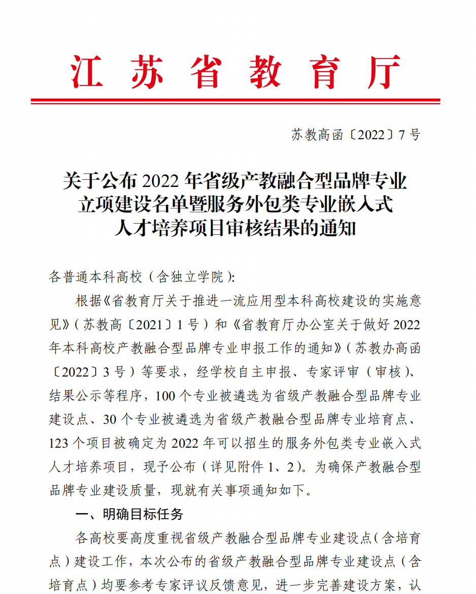 开元官网获批2022年省级产教融合型品牌专业及服务外包类专业嵌入式人...