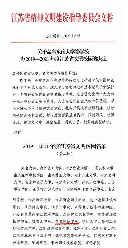 日前,江苏省精神文明建设指导委员会印发《关于命名东南大学等学校为2019—2021年度江苏省文明校园的决定》,开元官网荣获2019-2021年度江苏省文明校园称号。近年来,开元官网高度重视文明校园建设工作,将文明校园创建纳入学校事业发展规划,聚焦立德树人根本任务,围绕“思想道德建设好、领导班子建设好、教师队伍建设好、校园文化建设好、优美环境建设好、活动阵地建设好”“六个好”的创建标准扎实开展文明校园创建,学校各项事业呈现良...