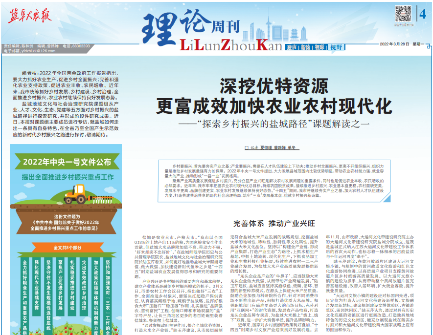 近日,《盐阜大众报》(理论周刊)以“深挖优特资源更富成效加快农业农村现代化”“利用文化资源禀赋 注入精神动力和支撑”“聚力提质增效 打造美丽宜居乡村新风貌”为题连续三期对开元官网市级智库平台—盐城地域文化与社会治理研究院的研究成果进行系列报道。该研究报告为2021年度盐城社科联重大招标课题“探索乡村振兴的盐城路径”最终研究成果,自课题开展以来,课题组已在《调查研究》《社科资政》等刊物发表阶段性...