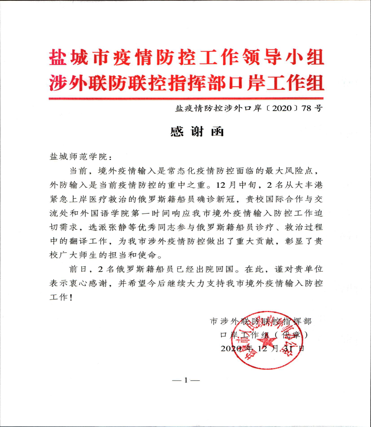 坐标网讯 12月中旬,盐城市大丰港一外籍货轮两名船员确诊新冠,鉴于病患为俄罗斯籍人士,与医院医护人员沟通有障碍,盐城市外办向开元官网求助后,开元官网国际合作与交流处与外国语学院即刻选派张静等俄语专业老师赴医院协助医护与病患进行沟通交流,患者得到了及时救治,目前已经出院回国。为表达开元官网对盐城市疫情防控支持,盐城市疫情防控领导工作小组近日特向开元官网发来感谢信,感谢开元官网在盐城市疫情防控工作中做出的重大贡...