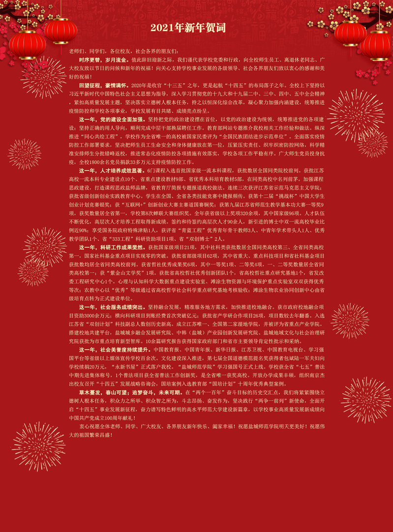 坐标网讯 12月31日,在2021年新年到来之际,党委书记戴斌荣,党委副书记、校长方忠面向全体师生、广大校友及关心学校事业发展的社会各界朋友发表2021年新年贺词。 全文如下: