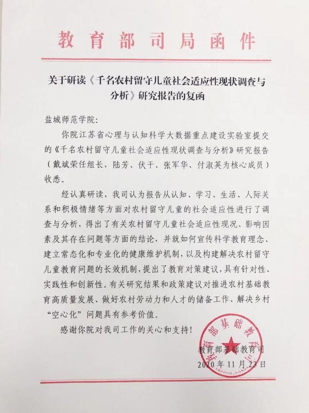 坐标网讯 近日,由江苏省心理与认知科学大数据重点建设实验室组织调研并撰写的研究报告《千名农村留守儿童社会适应性现状调查与分析》获教育部基础教育司采纳批示。 批示指出:报告对农村留守儿童的社会适应性进行了调查与分析,得出了有关农村留守儿童社会适应性现况、影响因素及其存在问题等方面的结论,并就如何宣传科学教育理念、建立常态化和专业化的健康维护机制,以及构建解决农村留守儿童教...