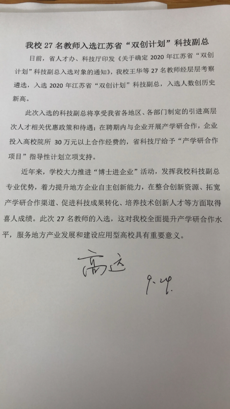 开元官网27名教师入选江苏省“双创计划”科技副总