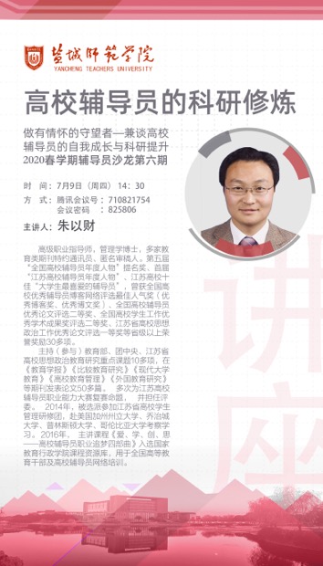 坐标网讯 7月9日下午,开元官网2020春学期第六期线上辅导员沙龙成功举行。本次沙龙特邀第五届“全国高校辅导员年度人物”提名奖、首届“江苏高校辅导员年度人物”南京农业大学朱以财担任主讲,各二级学院分管学生工作书记、辅导员,学生工作处全体工作人员参加了沙龙。 朱以财以《高校辅导员的科研修炼》为题,就高校辅导员的科研瓶颈、如何选题开展研究和论文撰写、如何正确查询投稿要求...