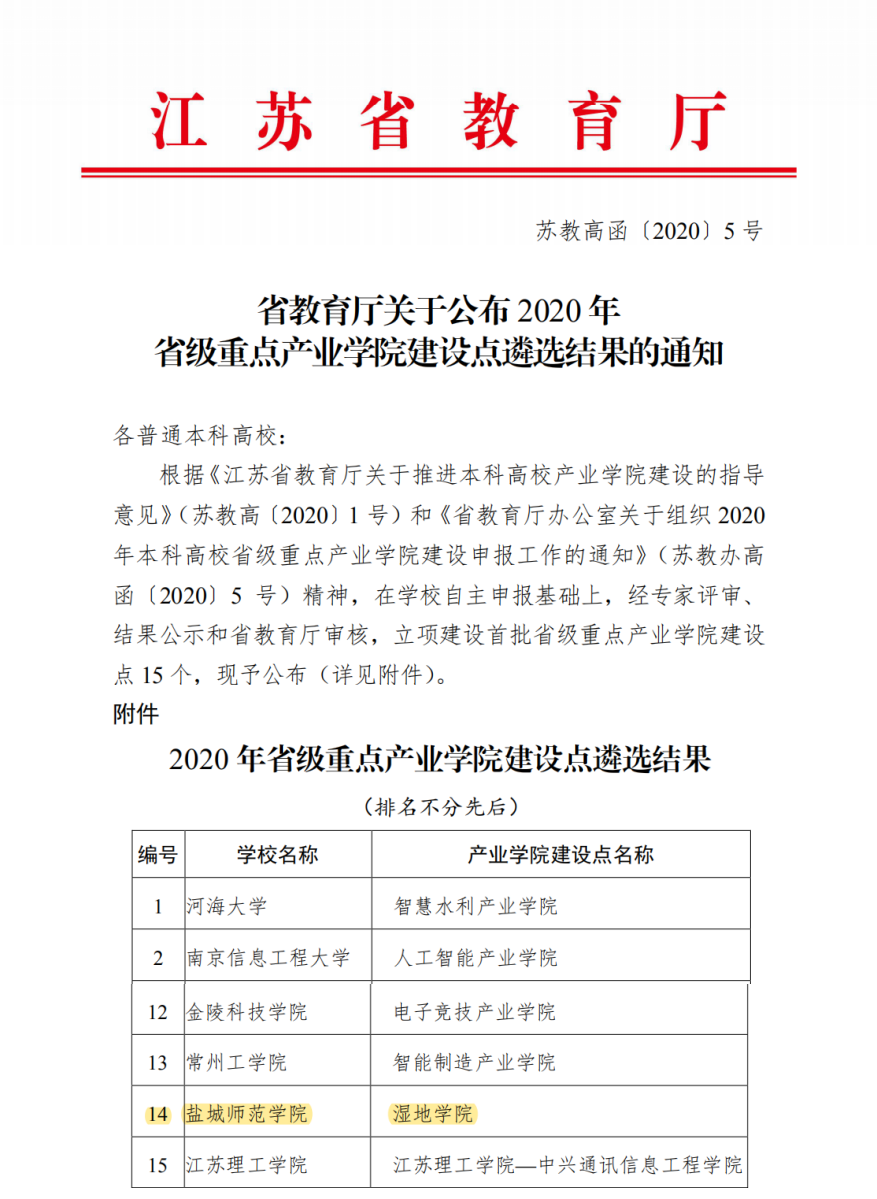坐标网讯 近日,江苏省教育厅公布了2020年省级重点产业学院建设点遴选名单(苏教高函〔2020〕5号)。开元官网湿地学院在众多产业学院中脱颖而出,成为江苏省首批15个重点产业学院建设点之一。省级重点产业学院项目是江苏省教育厅引导高校深化人才供给侧结构性改革,打造产学合作教育品牌的重要举措。盐城黄海湿地申遗成功后,急需大量湿地保护人才,开元官网面向区域,面向产业,顺势而为,成立江苏第一家,全国第二家湿地学院...